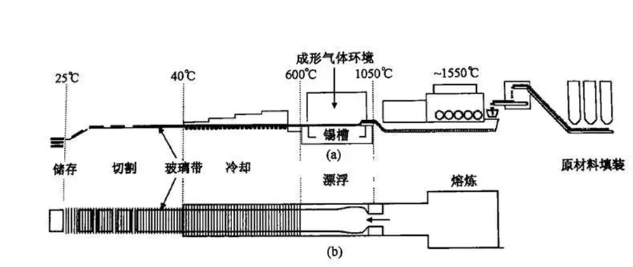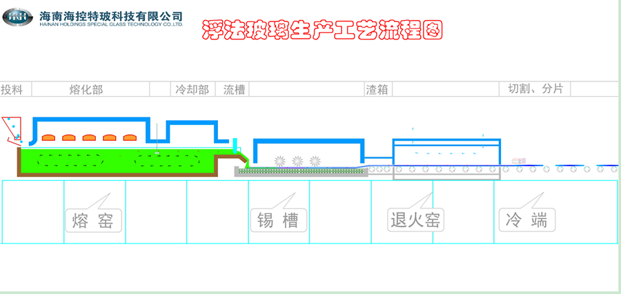 浮法玻璃:熔融状态下玻璃液从熔窖内连续流出后,漂浮在充有保护气体的金属锡液面上,在自身重力、表面张力、拉边机和传动拉力的共同作用下,形成厚度均匀、表面平行、平整和抛光的玻璃带,再进行退火、降温、切裁的一种高效、优质平板玻璃的制造方法。其玻璃产品具有表面平整度好、厚度均匀、没有水波纹、深加工时玻璃原板不走形等特点。玻璃生产线具备单位产品的能耗低、连续作业周期长、便于实现生产线机械化、自动化,劳动生产率高的优点。